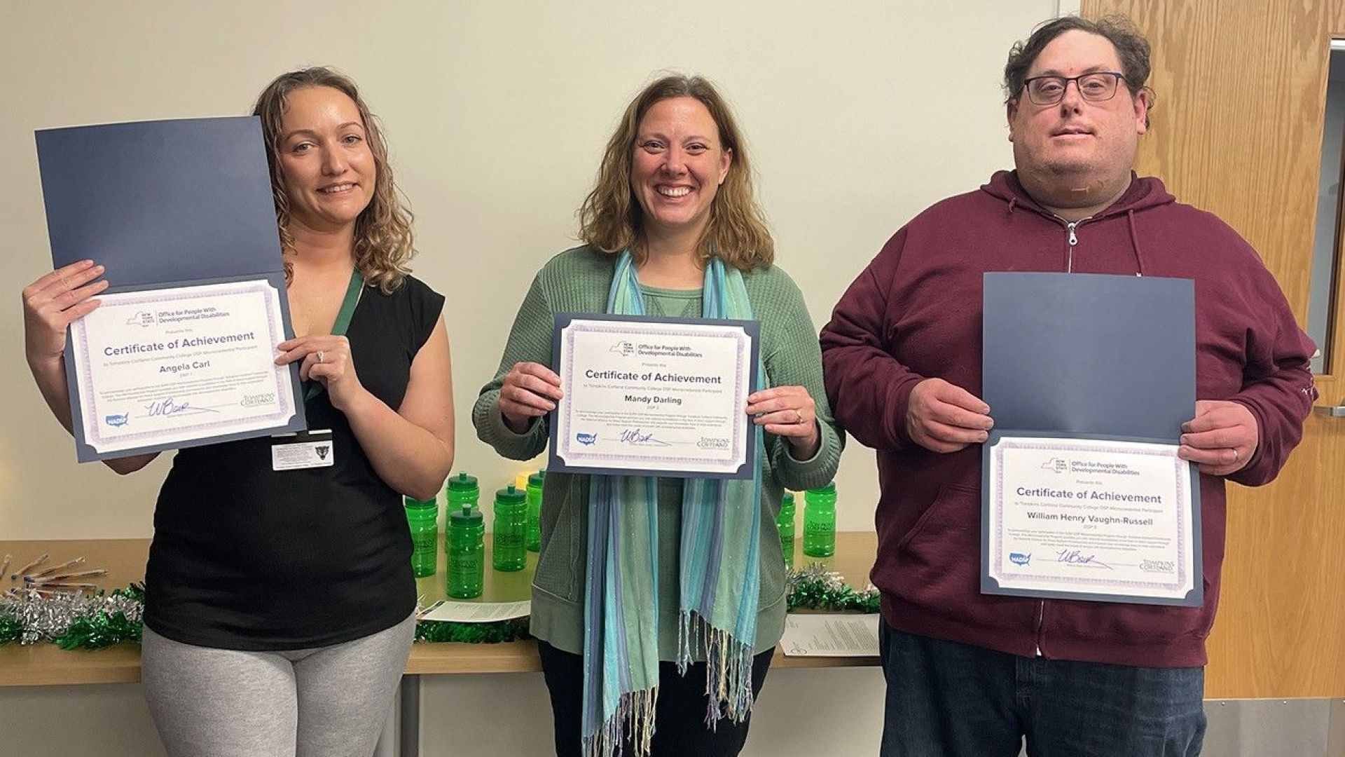 Tompkins Cortland Community College joined with The New York State Office for People With Developmental Disabilities (OPWDD) and The State University of New York (SUNY) on December 6 to recognize 15 students who have completed the Direct Support Professionals microcredential programs. Direct support professionals, or DSPs, help people with developmental disabilities succeed with daily living tasks, achieve their goals, find and keep a job, and participate fully in their communities.