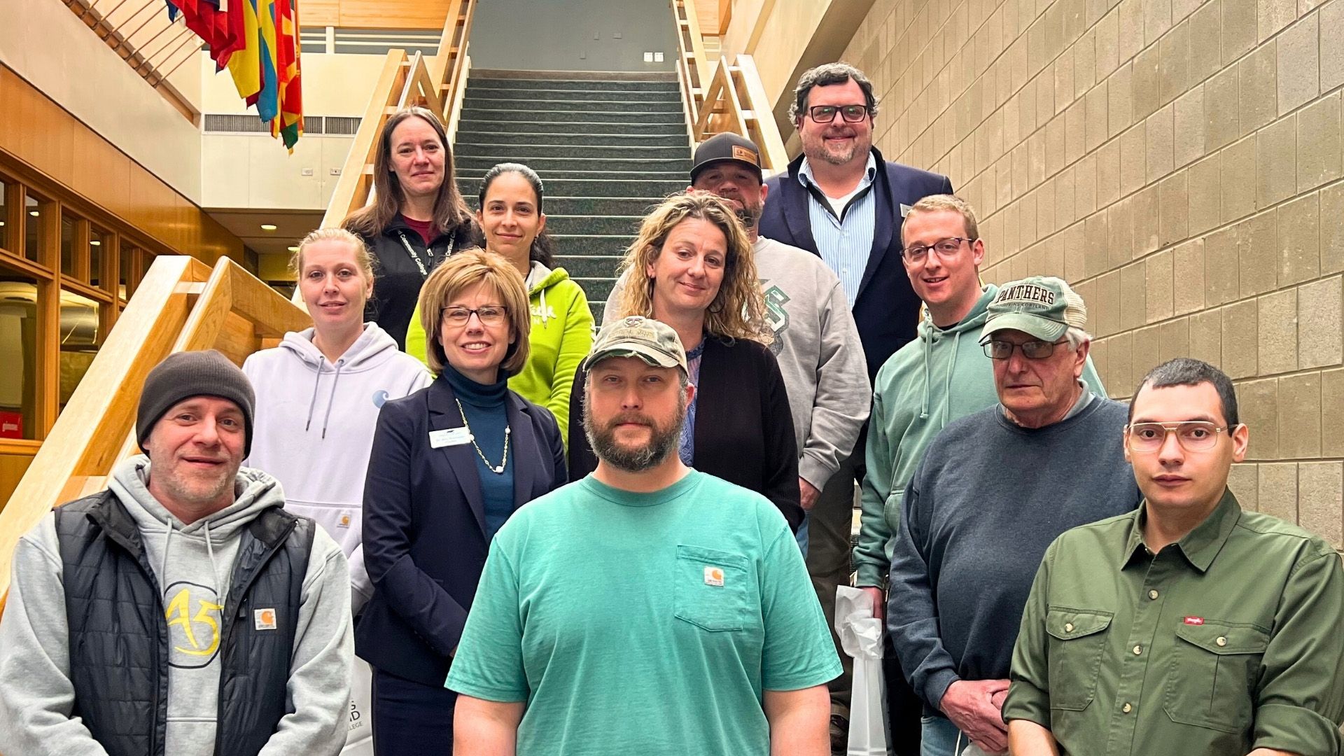 Photo Caption (from left to right):  Front row: Damon Cochrane, Senior Groundskeeper; Kyle Darling, Maintenance Worker; Marcus Sherman, Cleaner. Second row: Jessica Lafever, Senior Cleaner; Amy Kremenek, President; Shelley Knickerbocker, Campus Environmental Health and Safety Officer; Dale Jacobs, Building Maintenance Worker. Third row: Blanca Carlton, Maintenance Worker; Jarid Poirier, Maintenance Worker; Frank Martin, Electrician. Last row: Emily Nelson, Cleaning Supervisor; Nicholas Dovi, Director of Facilities.