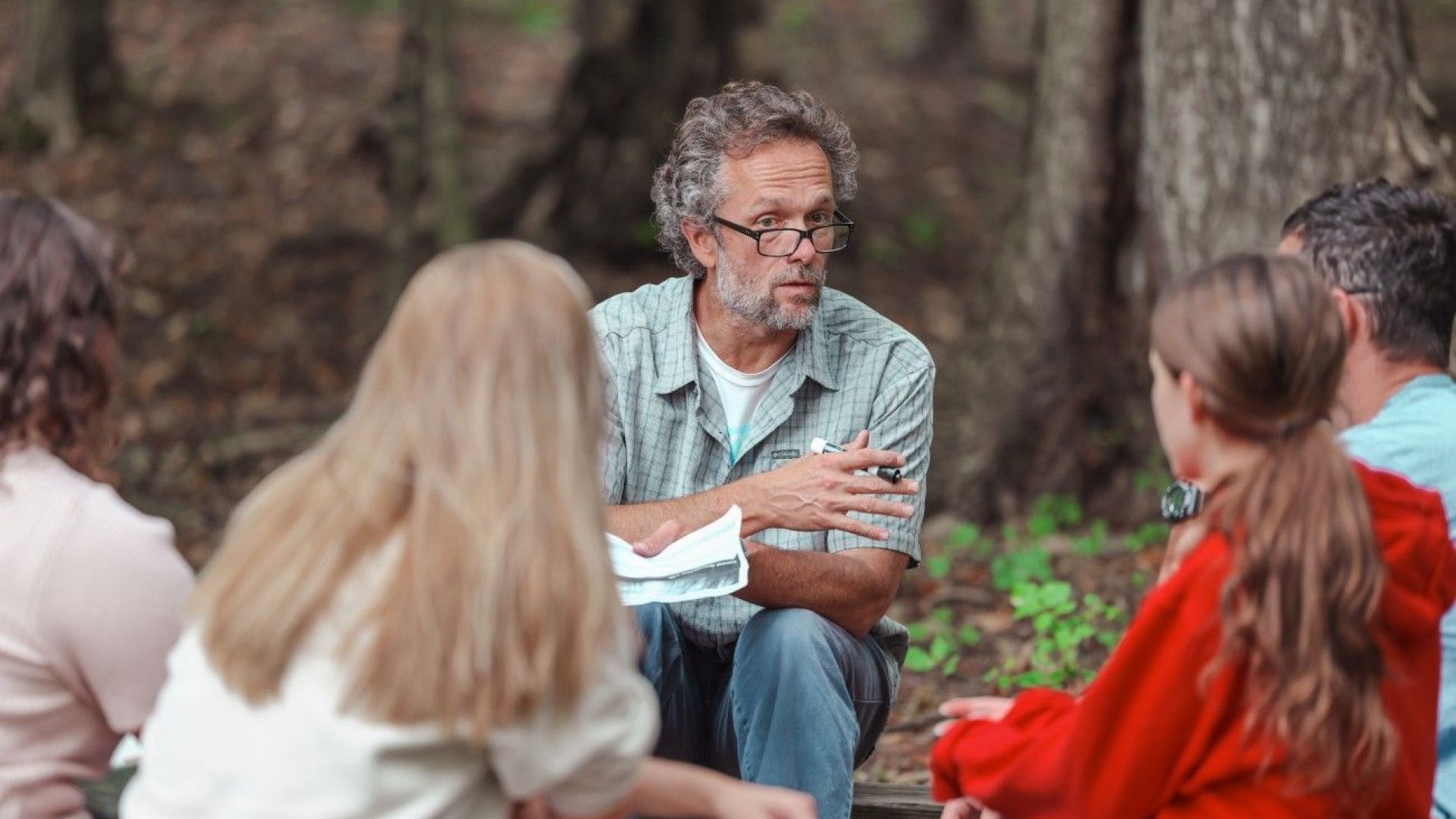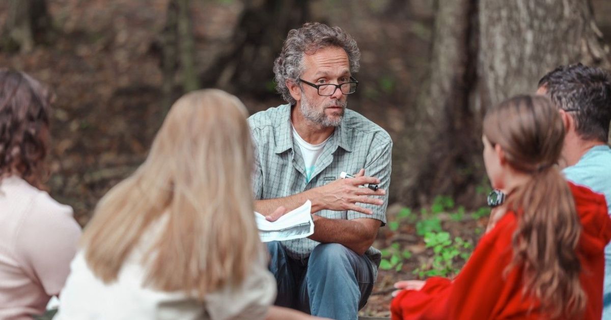 A professor sits outdoors in a forested area, engaging with a group of students seated around him, holding notes and gesturing while leading a discussion.