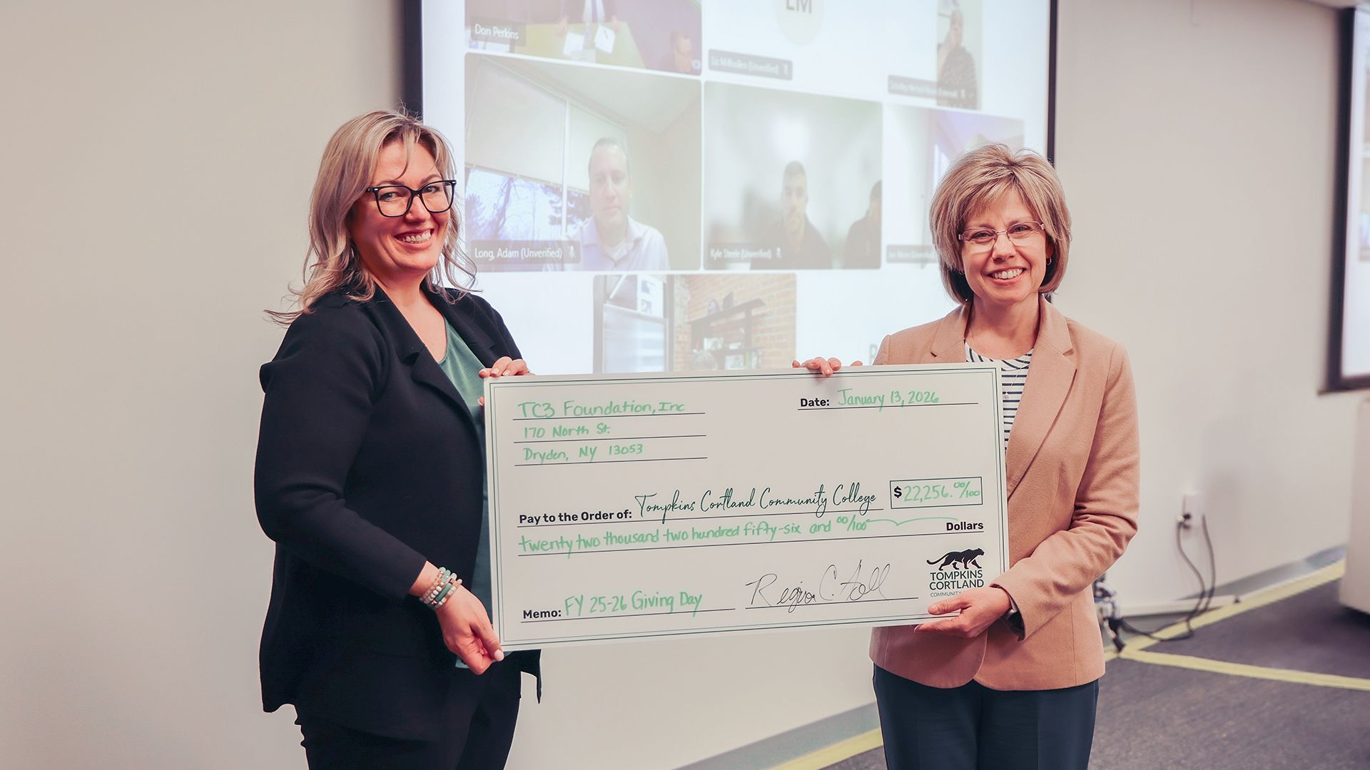 The TC3 Foundation has completed a successful Giving Tuesday fundraising campaign. Foundation Board Chair Kansas Underwood presented College President Amy Kremenek with a check for $22,256 at the Foundation Board meeting earlier this week.