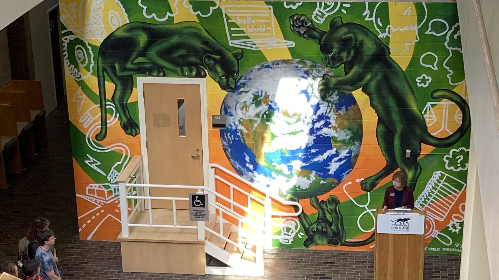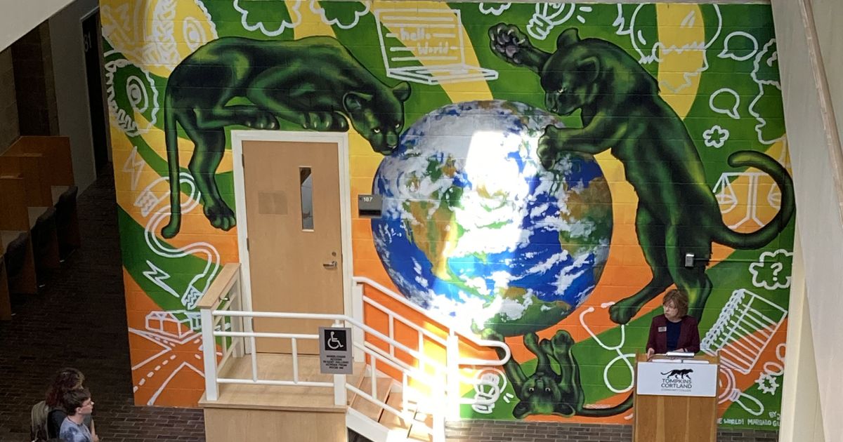 Thanks to the generosity of art supporters in the community, Tompkins Cortland Community College has a new mural on campus. The painting called “Panthers Take on the World” takes up a formerly bare wall in the TC3 cafeteria. The mural was completed by Margalo Guo in late spring; a celebration and ceremonial dedication was held September 30.