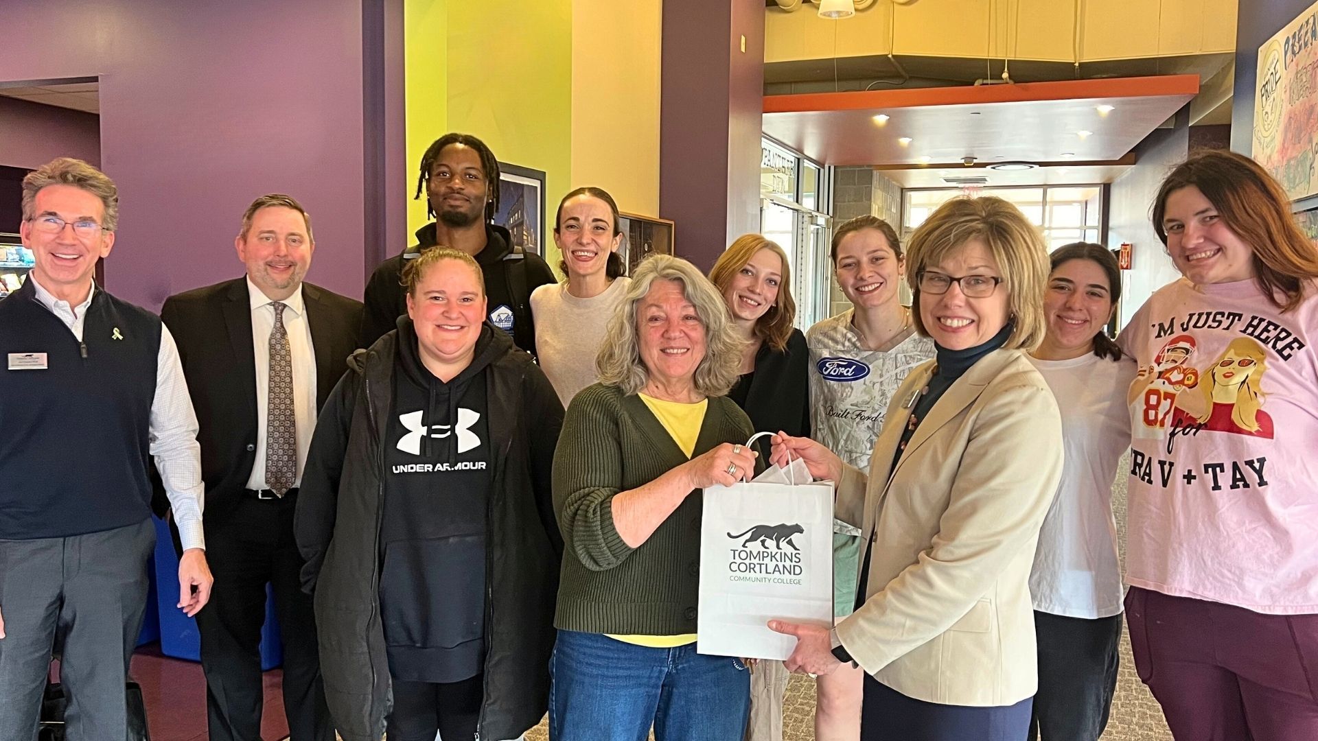 Photo Caption (from left to right): Front row: Residence Life Office Coordinator Laticia Caza, Employee of the Month Sidney Hill, President Amy Kremenek. Back row: Interim Associate Vice President of Student Affairs Joe Oravecz, Vice President of Enrollment Management and Student Affairs Robert Palmieri, Student Jaime Kayembe, Director of Residence Life Natalie Brewster, Student Brooke Seiger, Student Mati Lord, Student Sofia Lorenzo, Student JuShawna Crane.