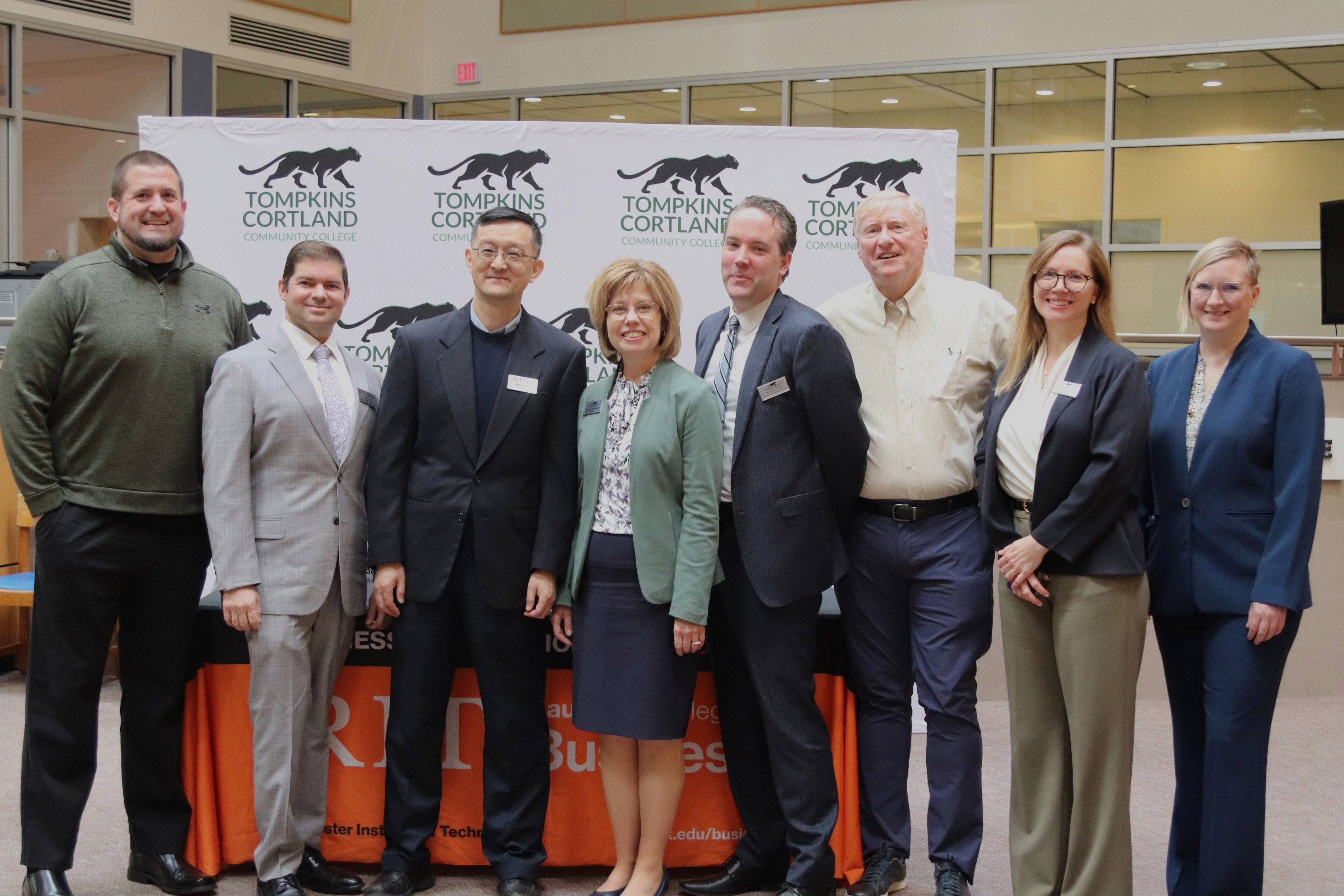 RIT Saunders College of Business Associate Director of Student Services Matthew Cornwell, RIT Professor and Chair for Department of International Hospitality and Service Innovation Edwin Torres, RIT Saunders College of Business Senor Associate Dean John Tu, TC3 President Amy Kremenek, TC3 Provost Aaron Tolbert, TC3 Professor Tim McCabe, TC3 Associate Dean of Academic Affairs Merryn Clay, and TC3 Associate Provost Anndrea Mathers