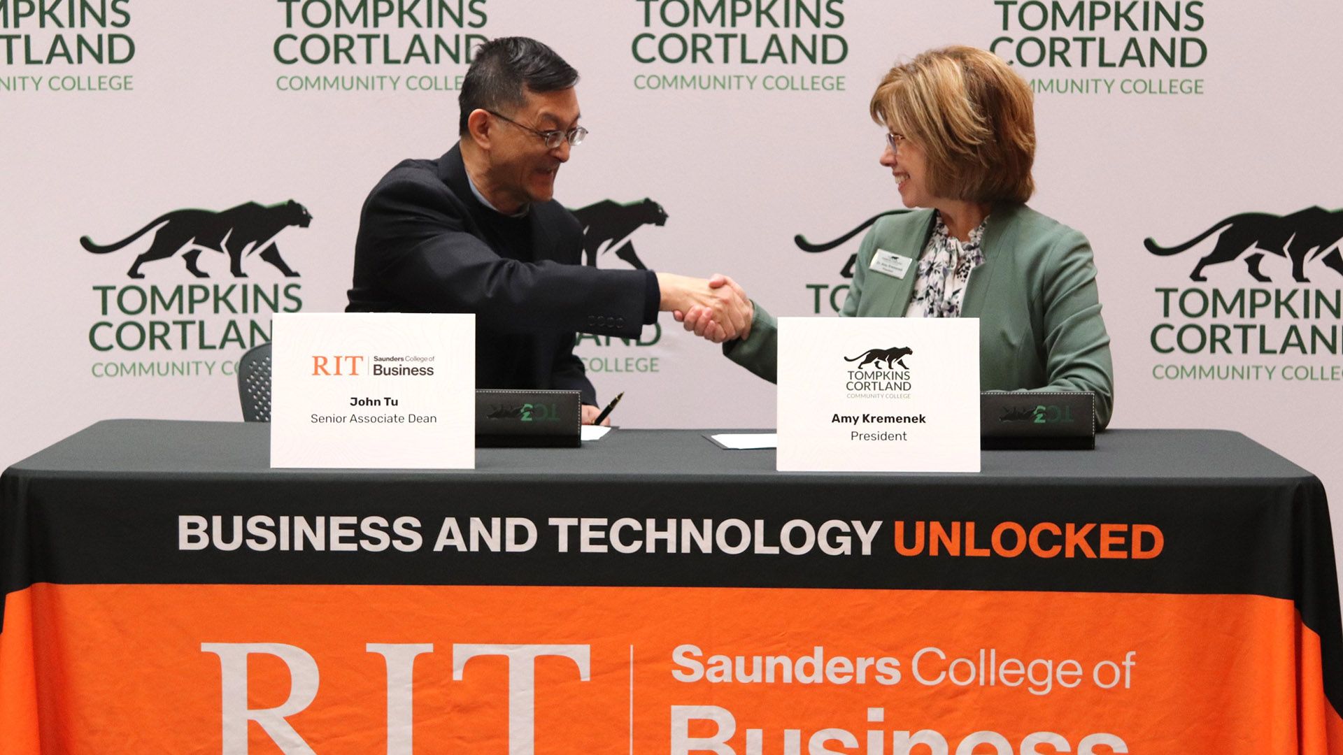 Tompkins Cortland Community College (TC3) and Rochester Institute of Technology (RIT) have announced three new transfer agreements that provide TC3 graduates a direct transfer pathway into bachelor’s degree programs in the RIT Saunders College of Business. The agreements were signed by TC3 President Amy Kremenek and Saunders College of Business Senior Associate Dean John Tu at a ceremony on the Dryden campus.