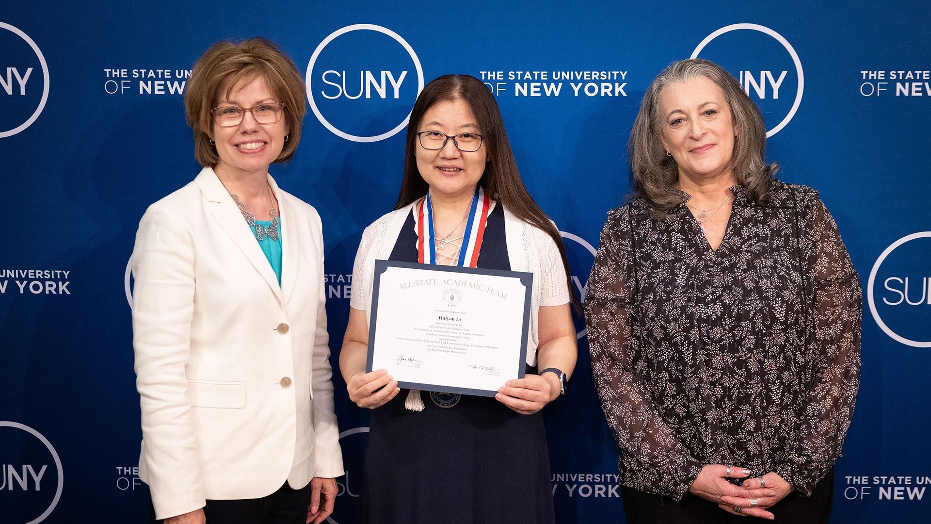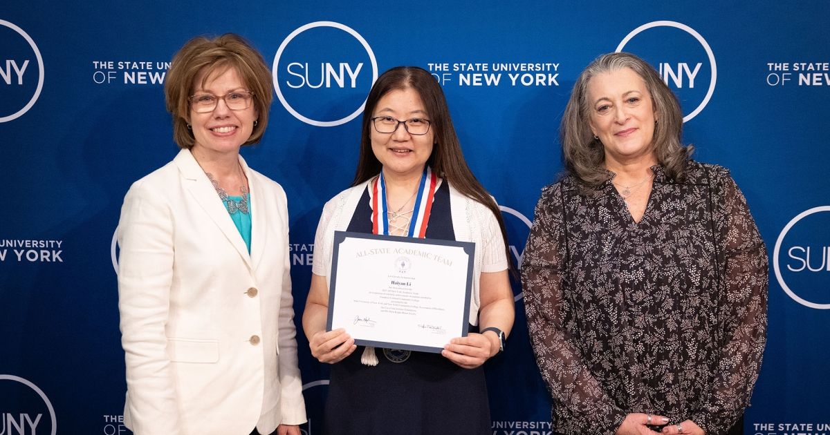 Tompkins Cortland Community College student Haiyan Li has been honored by Phi Theta Kappa, the international honor society for community colleges. Li was named recipient of the Phi Theta Kappa All-New York Academic Award, an honor bestowed on a small percentage of members of the international honor society. All the statewide winners were recognized at a ceremony in Albany during the spring semester.